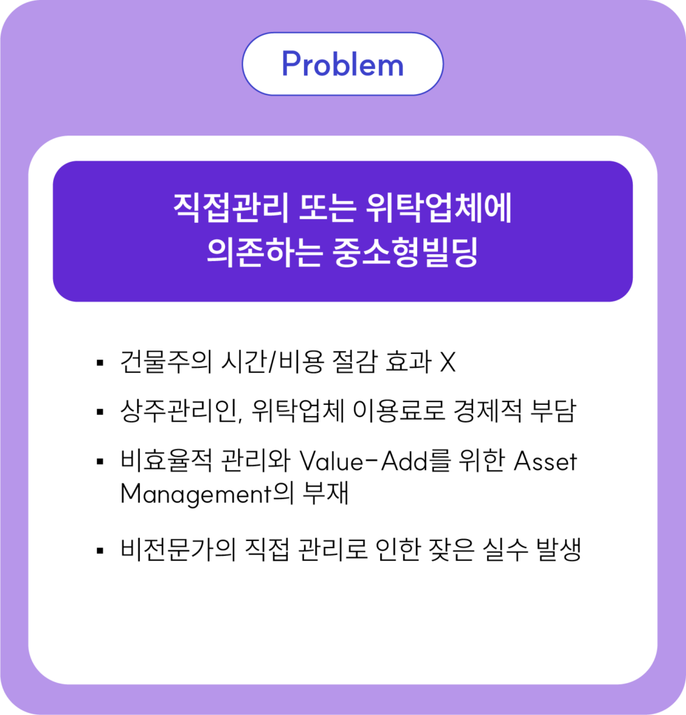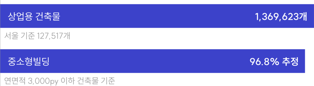 2024년 기준 전국의 중소형빌딩의 숫자는 130만여개입니다. 중소형빌딩의 수는 이렇게 많지만 중소형빌딩을 위한 종합관리서비스는 턱없이 부족합니다.
